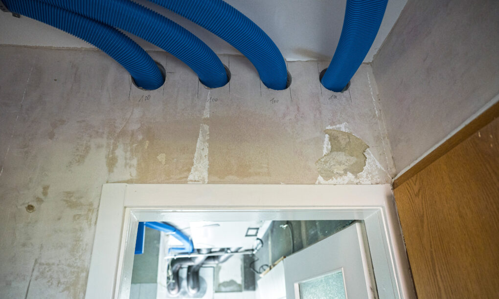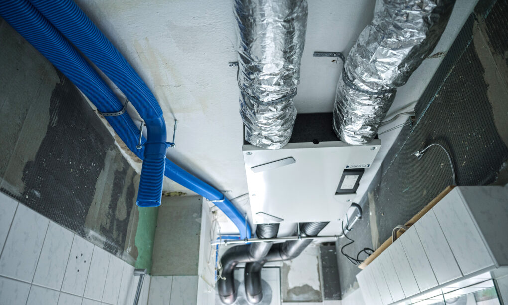 Das Wohnraumlüftungsgerät ist so kompakt, dass es als Deckengerät im Bad installiert werden konnte, nahe dem Fenster mit dem Wetterschutzgitter. Davon ausgehend, führen die Rohre unter der Decke entlang zu den weiterführenden Räumen. Dementsprechend mussten im Badezimmer und im Flurbereich die Decken abgehängt werden. Die Auslässe liegen in den einzelnen Räumen in Deckennähe und befördern die Luft unter Ausnutzung des Coanda-Effekts in die Zimmer.