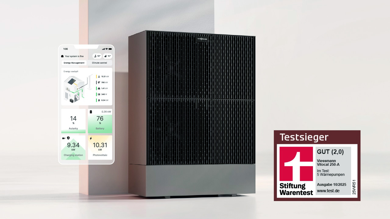 Nach dem Erfolg im Jahr 2023 wurde erneut eine Wärmepumpe aus dem Hause Viessmann Climate Solutions in der aktuellen Ausgabe 10/2025 der Stiftung Warentest als Testsieger ausgezeichnet. Die Luft-/Wasser-Wärmepumpe Vitocal 250-A mit 10 kW Nennwärmeleistung (Typ AWO-E AC 251.A10), setzte sie sich im Test durch und erhielt das Qualitätsurteil „GUT (2,0)“.